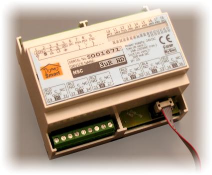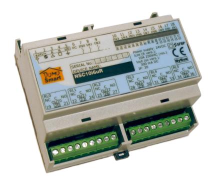 NSC +i Based Controller. Programmable via field bus. Model NSC106RHW: 10 logic inputs; 2 inputs for digital 1wire thermal sensor or analog 5V (autodetect); 6 x 16A (200A peak*) 250VAC relay outputs. Model NSC103RHW: like NSC106RHW but has only 3 relay outputs. Model NSC103RHWC: like NSC106RHW + RTC (Real Time Clock) on board. Model NSC103R: 10 logic inputs; 2 analog inputs; 6 x 8A 250VAC relay outputs. Clamping for DIN rail EN 60715 / EN50022; dimensions 106x90x57mm 6 modules DIN 43880. Dual mode power supply 12/24V. |