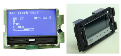NSC +i Based Controller with display. Programmable via field bus. 128x64 display; 4 keys; 3 logic inputs; 2 logic open collector outputs; 1 analog input; one DS1820 thermo sensor on board; automatic backlight; blue-white display. Dual mode power supply 12 to 24V. |
